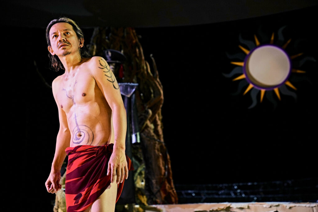 岡本はこの作品を通じて「今までに感じたことのない、本当のライブ感というものを感じた」とコメントしている。作品の舞台設計は象徴的で、島(舞台)には段ボールの箱や切れ端が散らばり、黒いビニールシートで海を表現し、マンガチックな太陽が空に配置されている。幹に祠のような、あるいは子宮のような空洞のある大木が存在し、その幹の先端が空(宇宙)とつながる構造となっている。