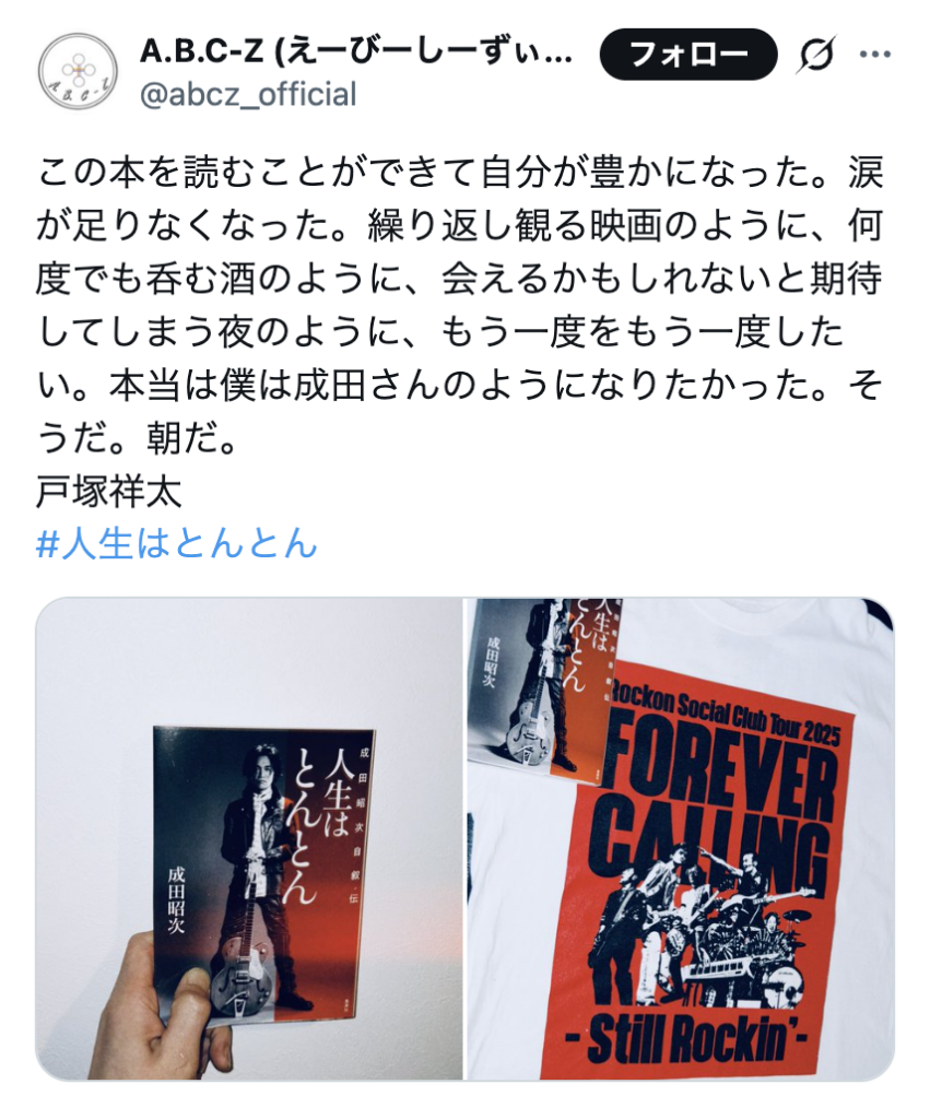 成田と同じ愛知県出身であり、かつて同じ事務所に所属していた後輩・A.B.C-Zの戸塚祥太は、Instagram、公式ファンクラブサイト、X(旧Twitter)とSNSを横断して本書への熱い想いを発信し続けている。