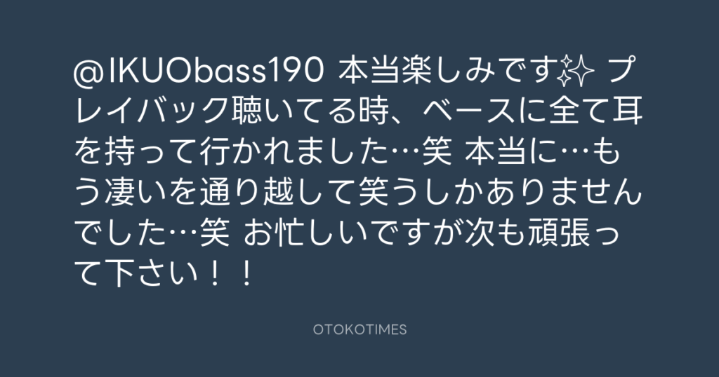 @IKUObass190 本当楽しみです✨ プレイバック聴いてる時、ベースに全て耳を持って...