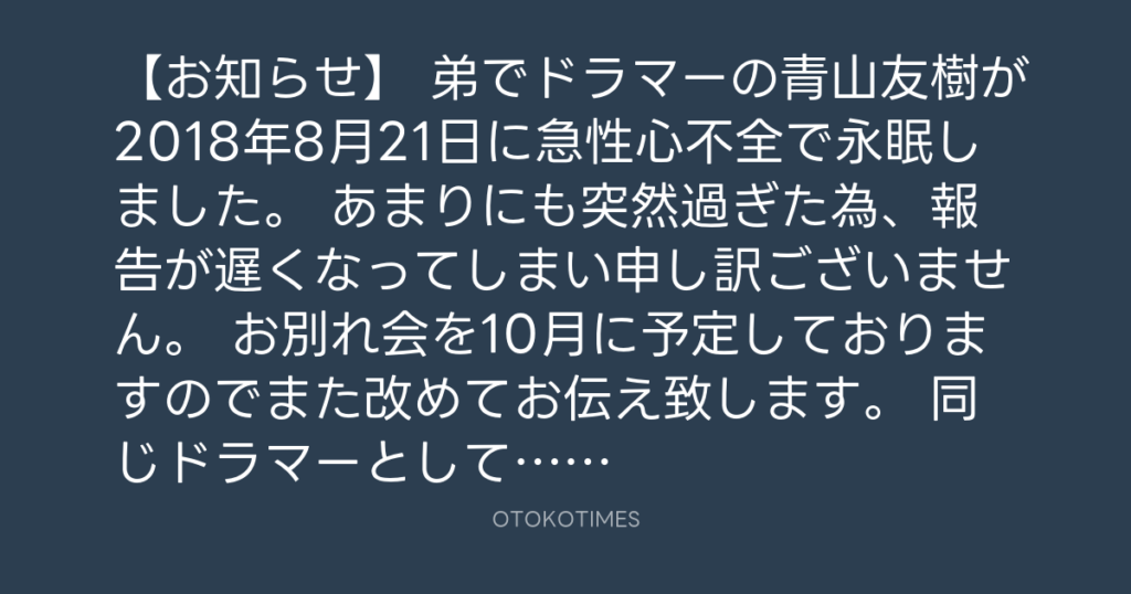 【お知らせ】 弟でドラマーの青山友樹が2018年8月21日に急性心不全で永眠しました... -