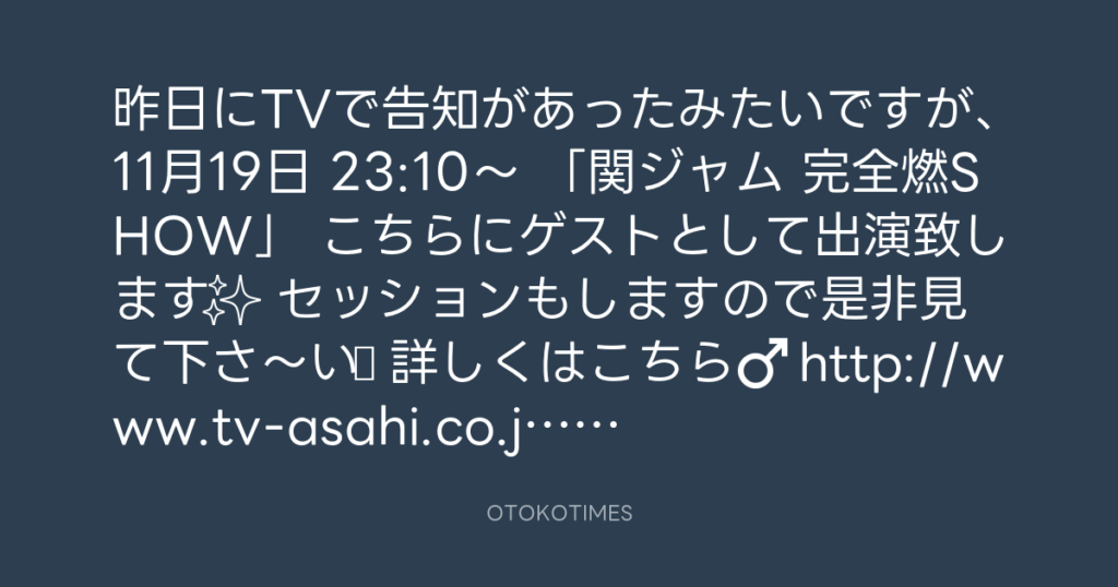 昨日にTVで告知があったみたいですが、11月19日 23:10〜 「関ジャム 完全燃SHOW」 ... -