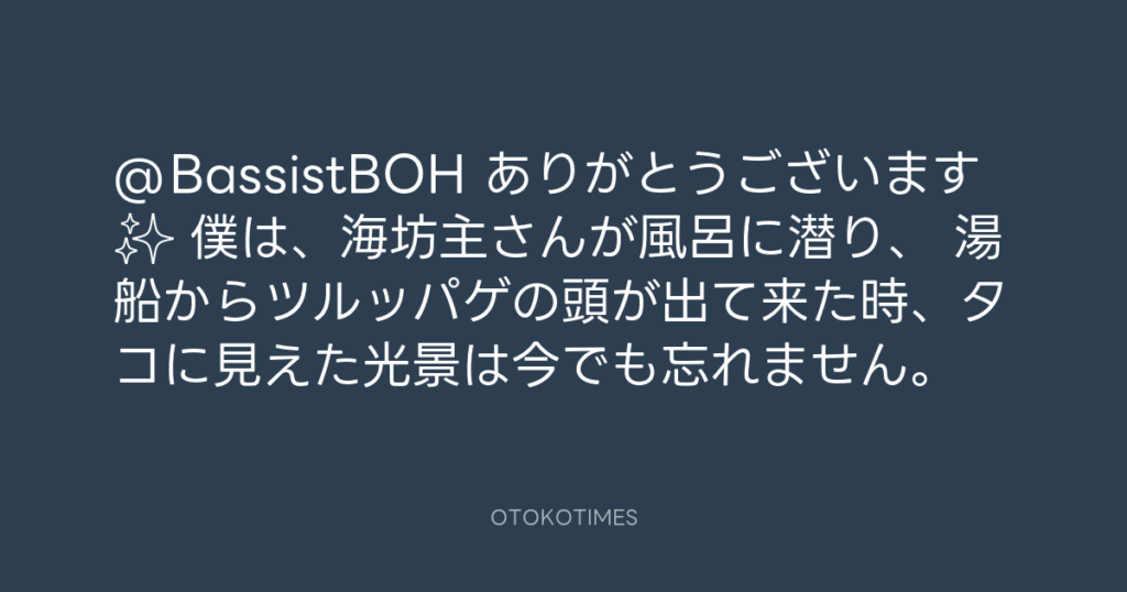 @BassistBOH ありがとうございます✨ 僕は、海坊主さんが風呂に潜り、 湯船からツ... -
