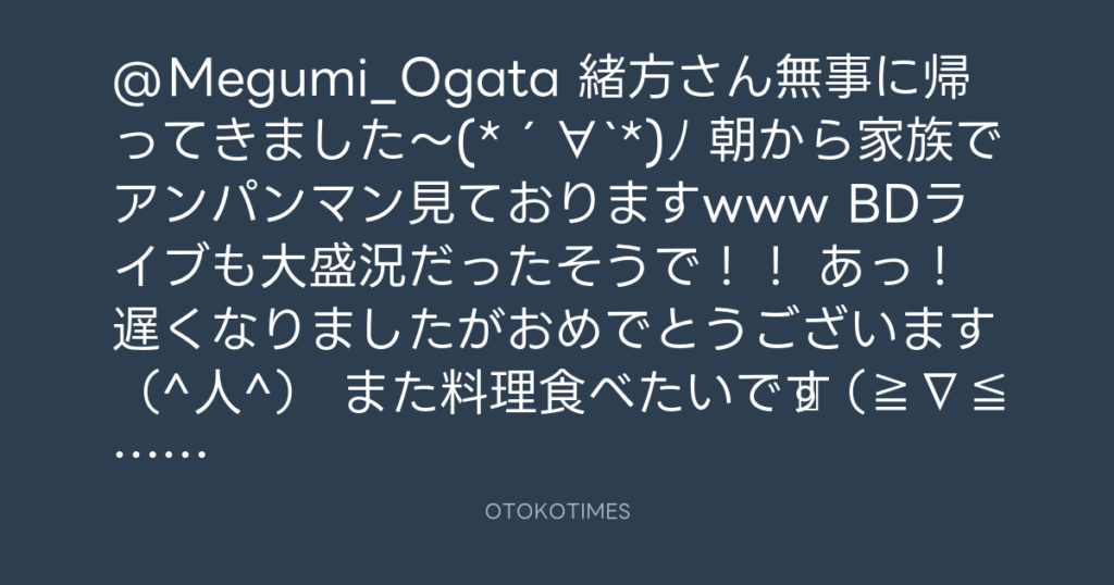 @Megumi_Ogata 緒方さん無事に帰ってきました〜(*´∀`*)ノ 朝から家族でアンパンマン... -
