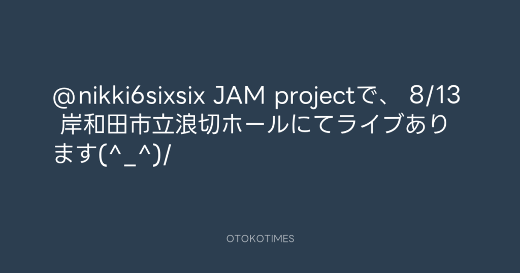@nikki6sixsix JAM projectで、 8/13 岸和田市立浪切ホールにてライブあります(^_^)/ -