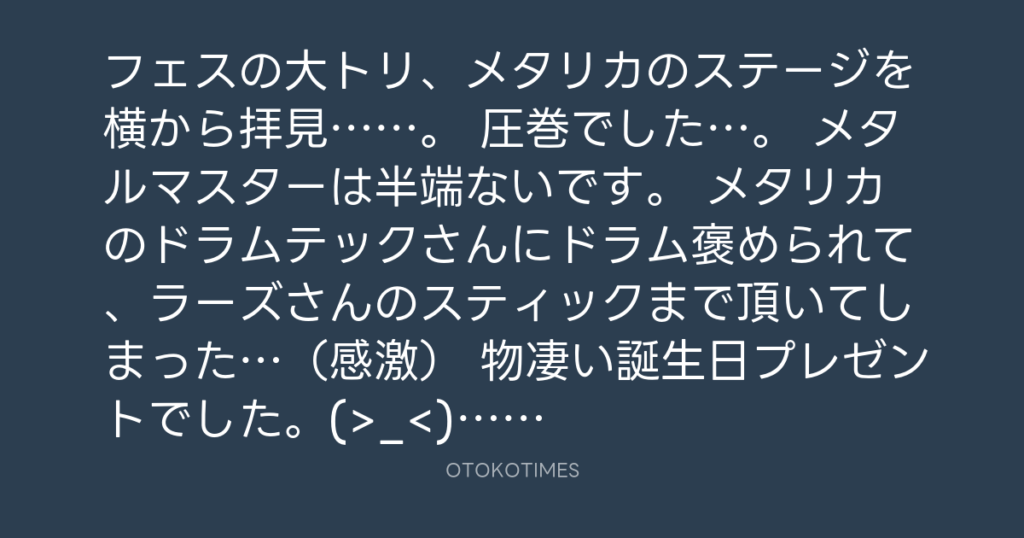 フェスの大トリ、メタリカのステージを横から拝見……。 圧巻でした…。 メタルマスタ... -