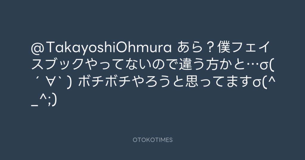 @TakayoshiOhmura あら?僕フェイスブックやってないので違う方かと…σ(´∀` ) ボチ... -