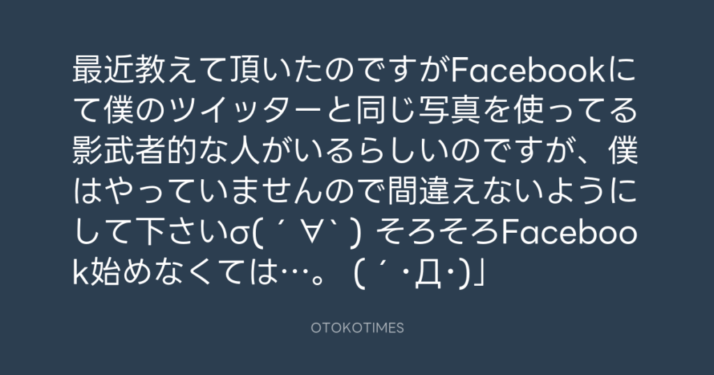 最近教えて頂いたのですがFacebookにて僕のツイッターと同じ写真を使ってる影武者... -