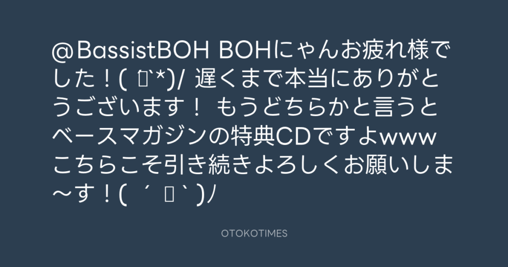 @BassistBOH BOHにゃんお疲れ様でした!(´▽`*)/ 遅くまで本当にありがとうございま... -