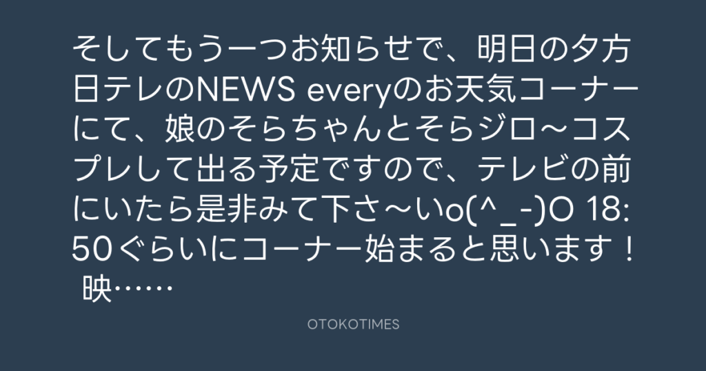 そしてもう一つお知らせで、明日の夕方日テレのNEWS everyのお天気コーナーにて、... -