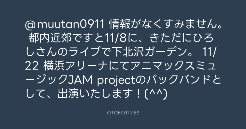 @muutan0911 情報がなくすみません。 都内近郊ですと11/8に、きただにひろしさんの... -