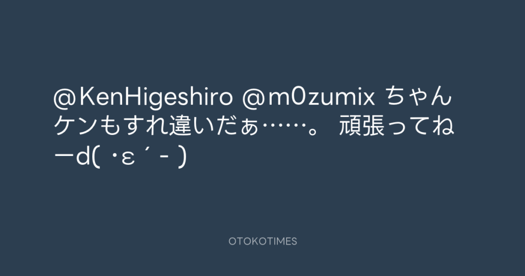 @KenHigeshiro @m0zumix ちゃんケンもすれ違いだぁ……。 頑張ってねーd( ・ε´- ) -