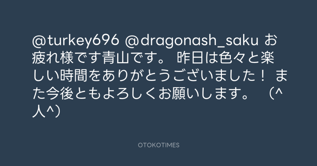 @turkey696 @dragonash_saku お疲れ様です青山です。 昨日は色々と楽しい時間をあ... -