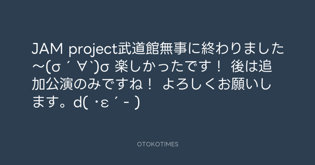 JAM project武道館無事に終わりました〜(σ´∀`)σ 楽しかったです! 後は追加公演の... -