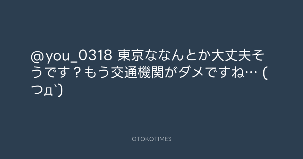 @you_0318 東京ななんとか大丈夫そうです?もう交通機関がダメですね… (つд`) -