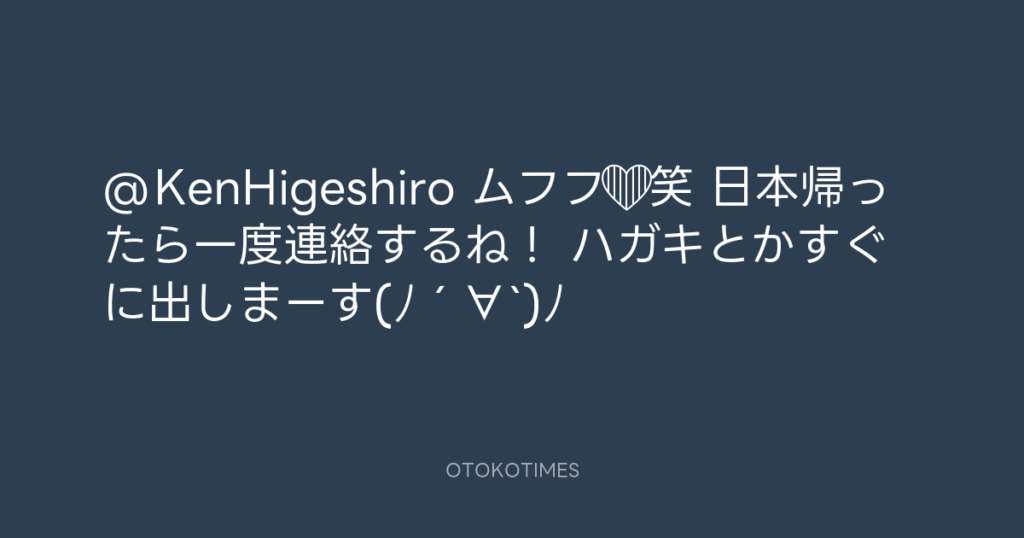 @KenHigeshiro ムフフ❤笑 日本帰ったら一度連絡するね! ハガキとかすぐに出しまー... -