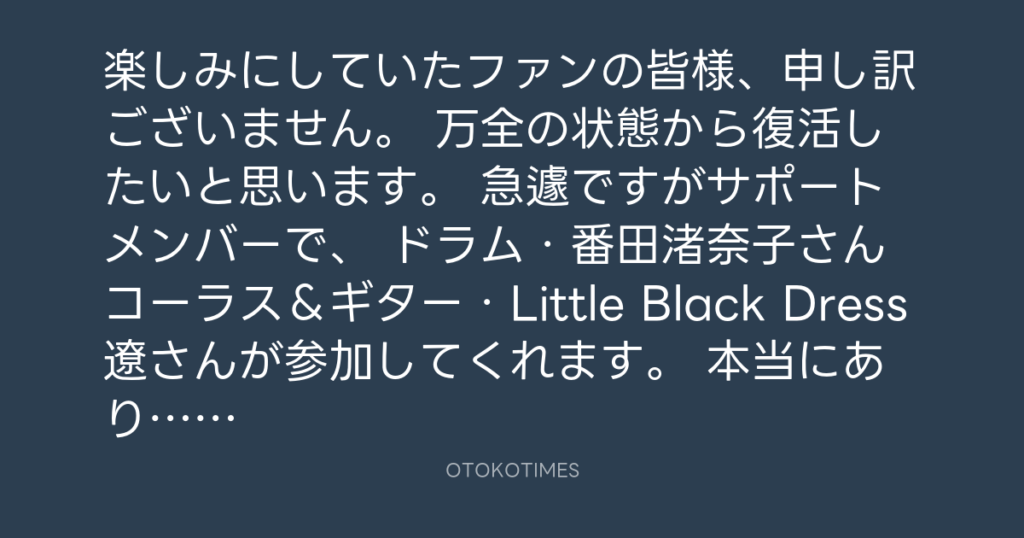 楽しみにしていたファンの皆様、申し訳ございません。 万全の状態から復活したいと... -