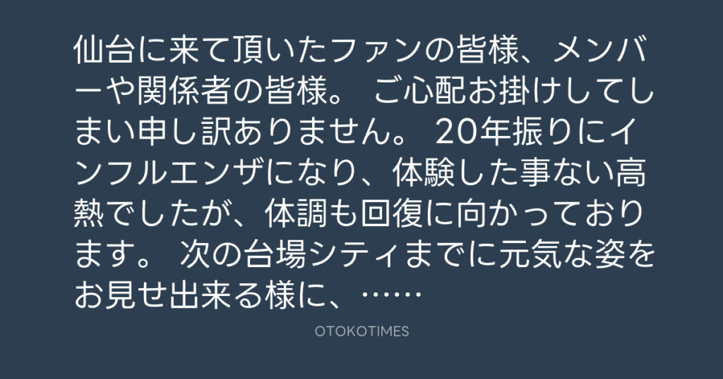 仙台に来て頂いたファンの皆様、メンバーや関係者の皆様。 ご心配お掛けしてしまい... -