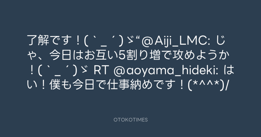 了解です!(`_´)ゞ“@Aiji_LMC: じゃ、今日はお互い5割り増で攻めようか!(`_´)ゞ... -