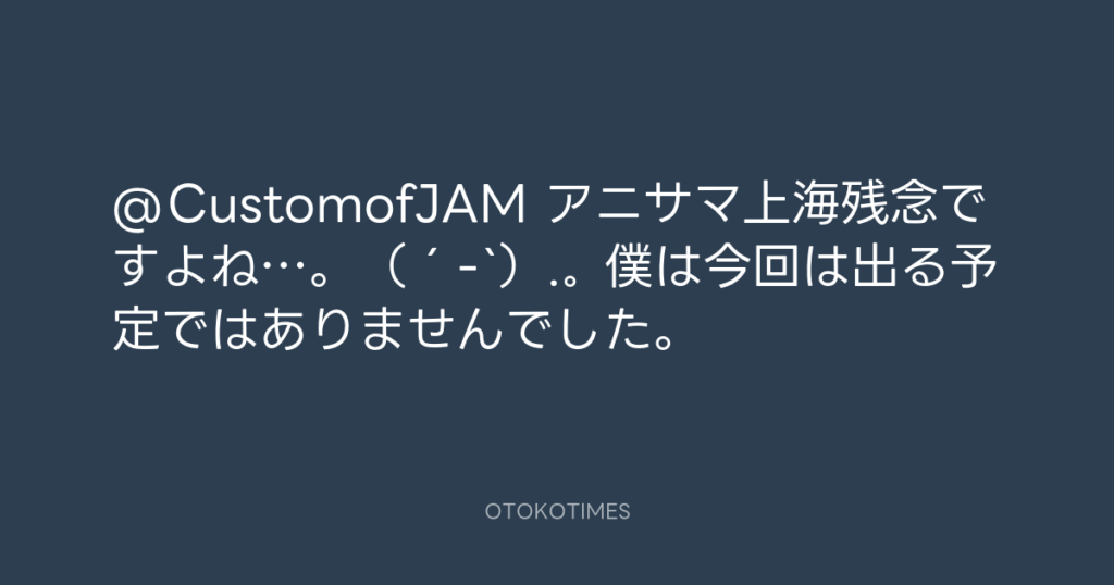 @CustomofJAM アニサマ上海残念ですよね…。(´-`).。 僕は今回は出る予定ではあり... -