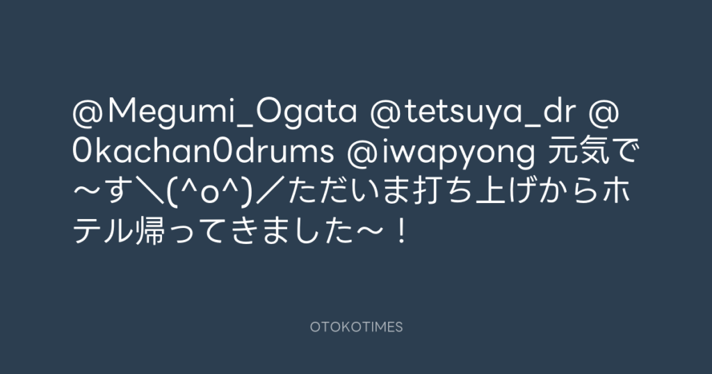 @Megumi_Ogata @tetsuya_dr @0kachan0drums @iwapyong 元気で~す\(^o^)/ただい...