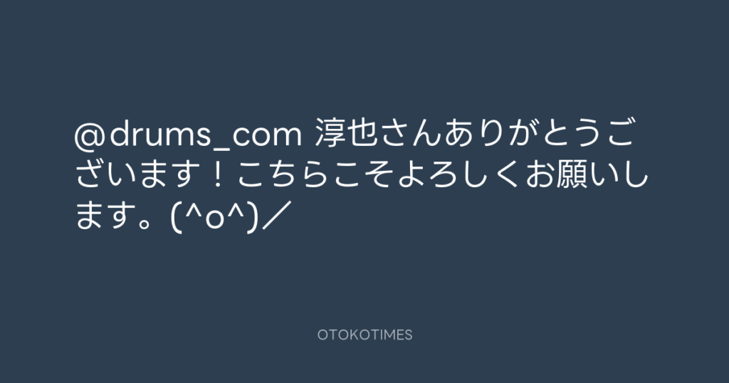 @drums_com 淳也さんありがとうございます!こちらこそよろしくお願いします。(^o^)/ -