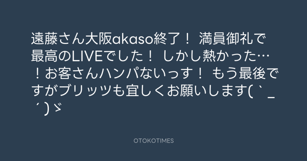 遠藤さん大阪akaso終了! 満員御礼で最高のLIVEでした! しかし熱かった…!お客さ... -