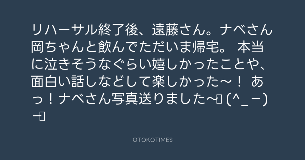 リハーサル終了後、遠藤さん。ナベさん岡ちゃんと飲んでただいま帰宅。 本当に泣き... -