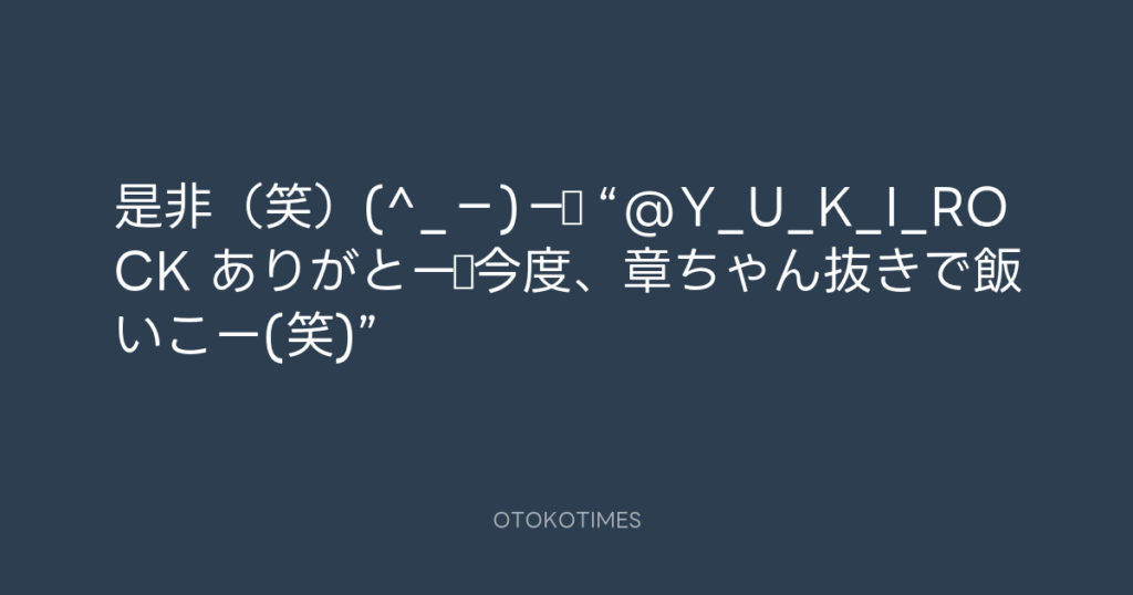 是非(笑)(^_−)−☆ “@Y_U_K_I_ROCK ありがとー☆今度、章ちゃん抜きで飯いこー(笑)” -