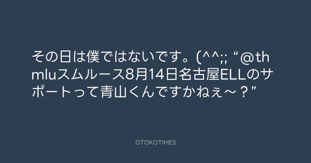 その日は僕ではないです。(^^;; “@thmluスムルース8月14日名古屋ELLのサポートって... -