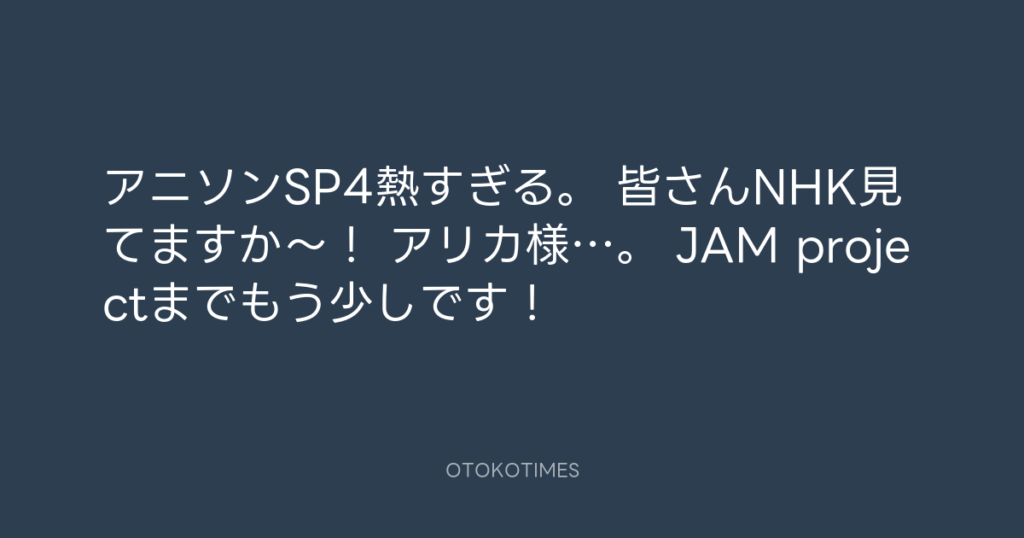 アニソンSP4熱すぎる。 皆さんNHK見てますか~! アリカ様…。 JAM projectまでもう... -