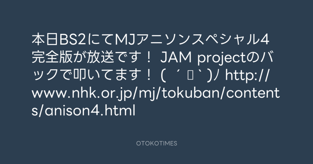 本日BS2にてMJアニソンスペシャル4完全版が放送です! JAM projectのバックで叩い... -