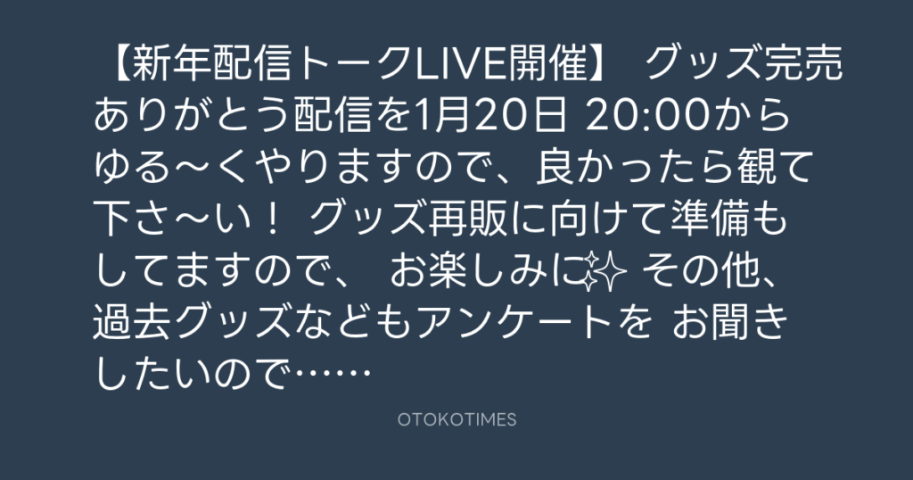【新年配信トークLIVE開催】 グッズ完売ありがとう配信を1月20日 20:00からゆる〜... -