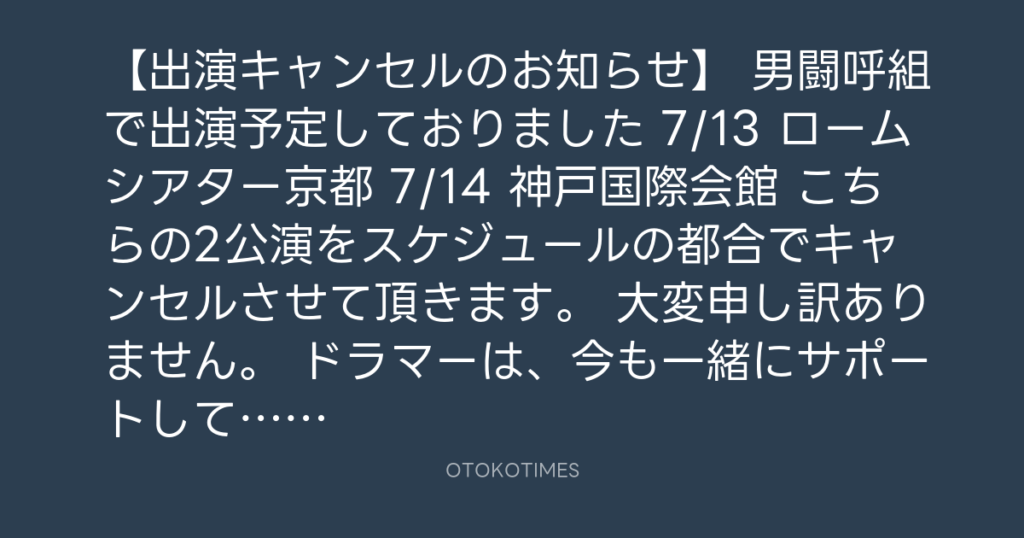 【出演キャンセルのお知らせ】 男闘呼組で出演予定しておりました 7/13 ロームシア... -