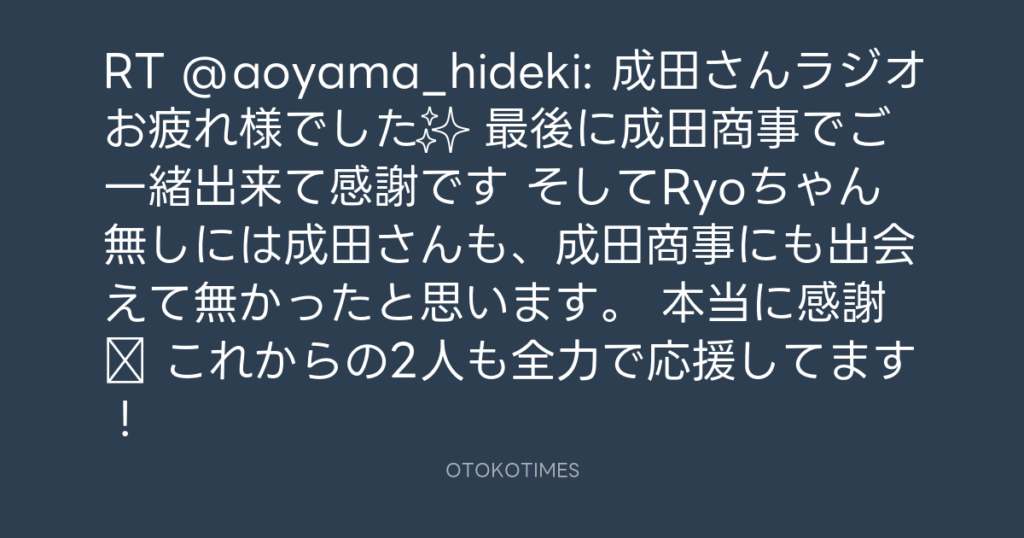 RT @aoyama_hideki: 成田さんラジオお疲れ様でした✨ 最後に成田商事でご一緒出来... -