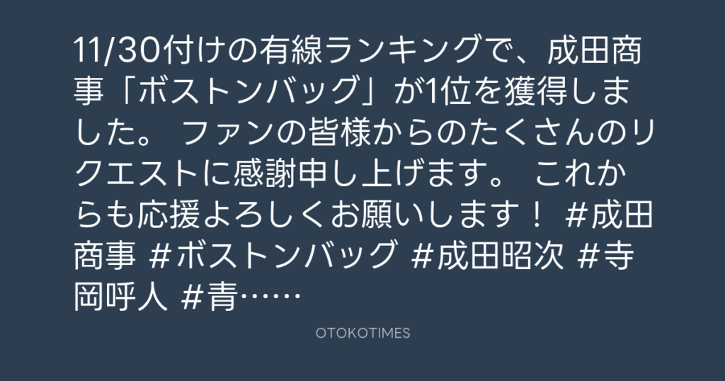 11/30付けの有線ランキングで、成田商事「ボストンバッグ」が1位を獲得しました。 ... -