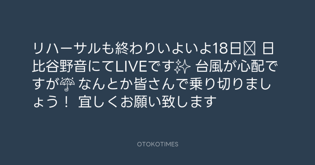 リハーサルも終わりいよいよ18日‼️ 日比谷野音にてLIVEです✨ 台風が心配ですが😅🌪... -