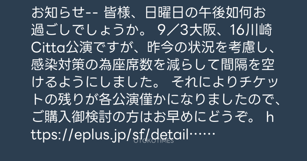 お知らせ-- 皆様、日曜日の午後如何お過ごしでしょうか。 9/3大阪、16川崎Citta公... -