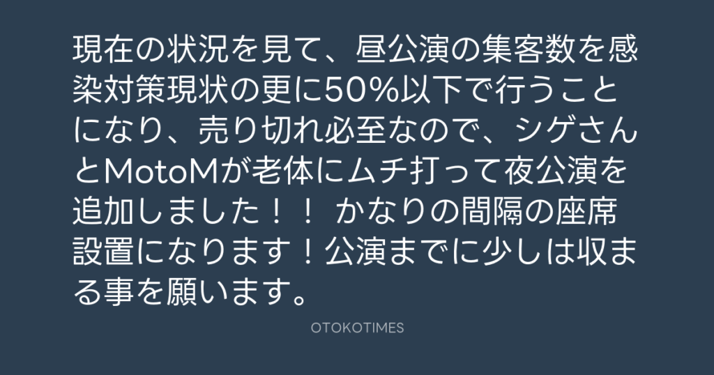 現在の状況を見て、昼公演の集客数を感染対策現状の更に50%以下で行うことになり... -