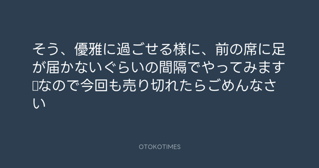 そう、優雅に過ごせる様に、前の席に足が届かないぐらいの間隔でやってみます♪なの... -