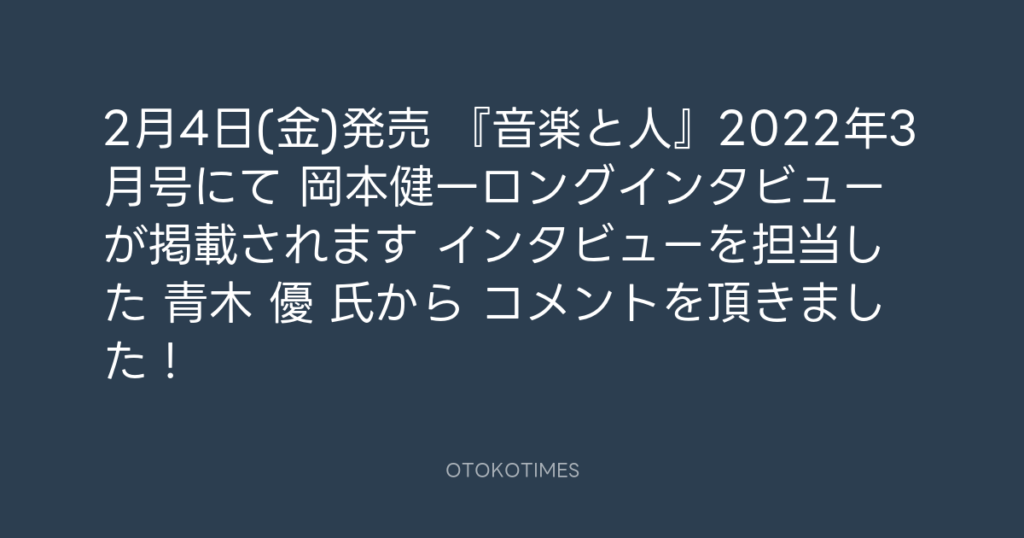 2月4日(金)発売 『音楽と人』2022年3月号にて 岡本健一ロングインタビュー が掲載...