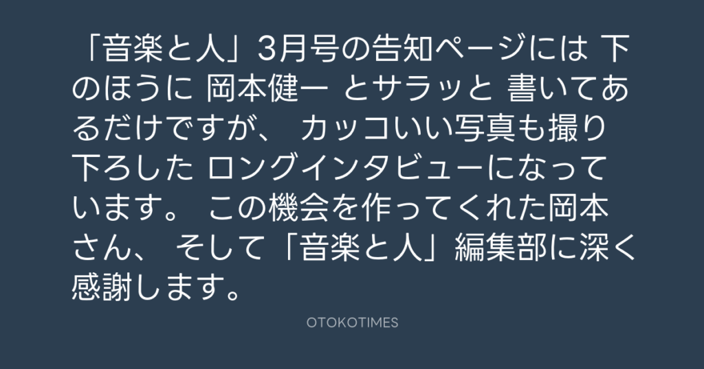 「音楽と人」3月号の告知ページには 下のほうに 岡本健一 とサラッと 書いてあるだ... -