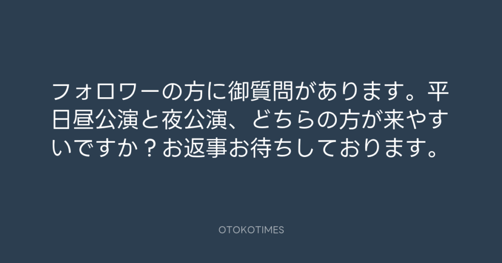 フォロワーの方に御質問があります。平日昼公演と夜公演、どちらの方が来やすいで... -