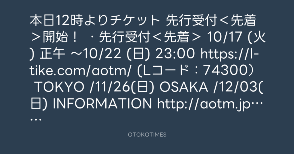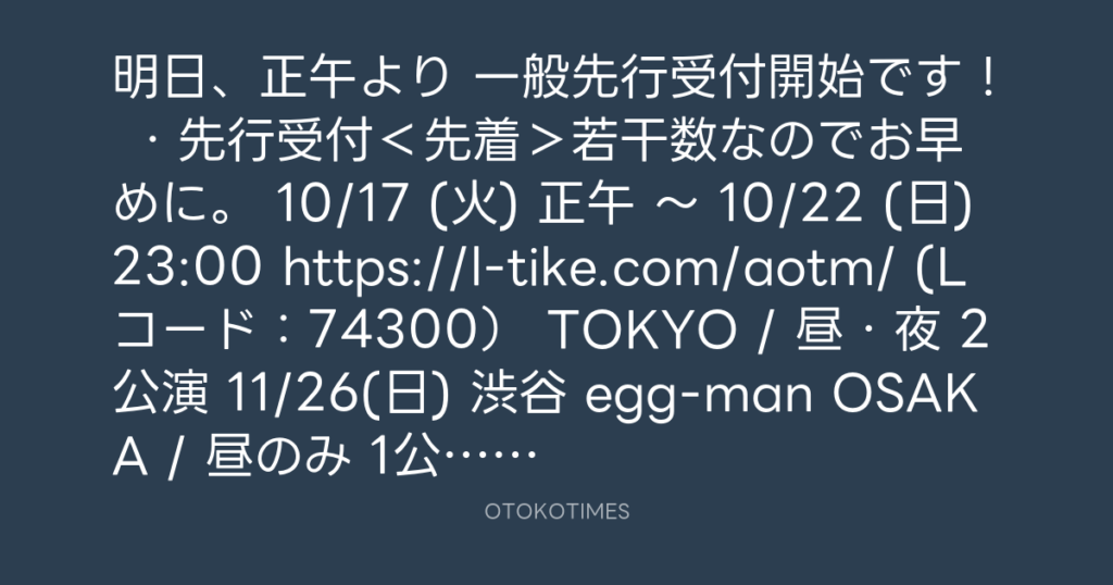 本日12時よりチケット 先行受付<先着>開始! ・先行受付<先着> 10/17 (火) 正... -