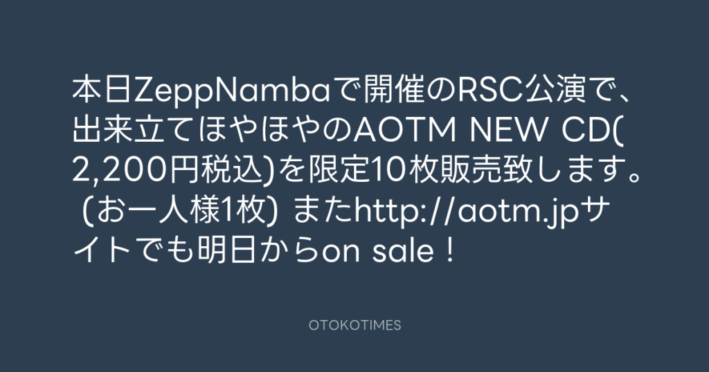 本日ZeppNambaで開催のRSC公演で、出来立てほやほやのAOTM NEW CD(2,200円税込)を... -