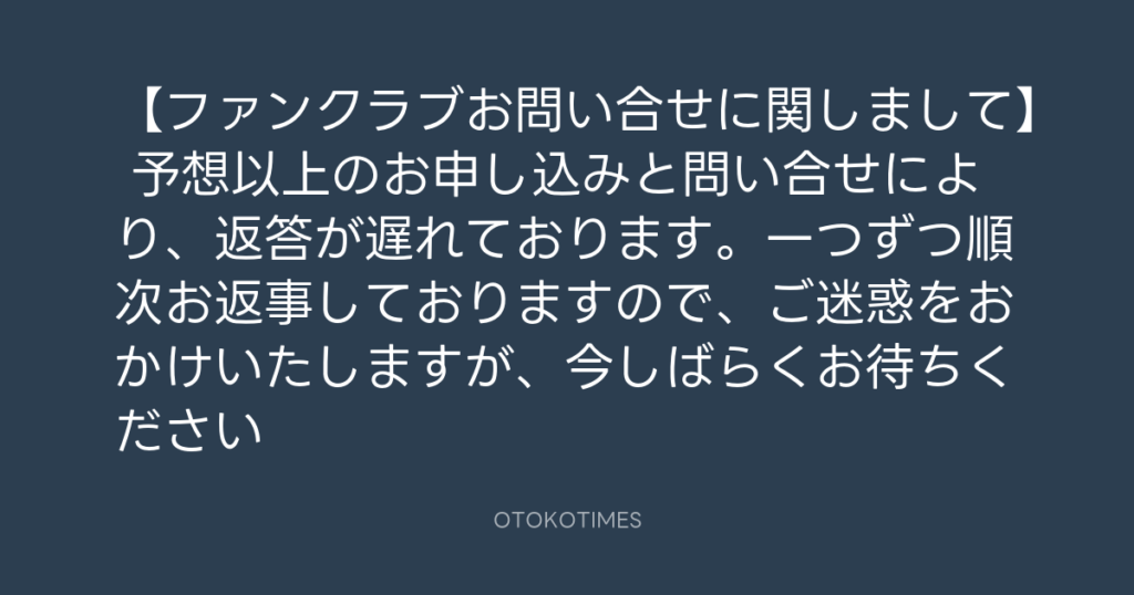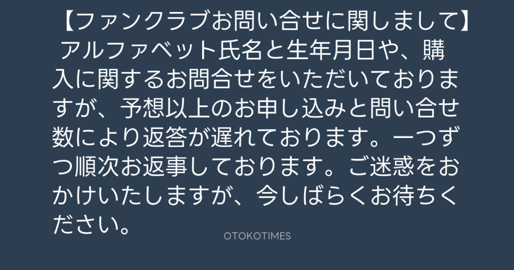 【ファンクラブお問い合せに関しまして】 予想以上のお申し込みと問い合せにより、... -