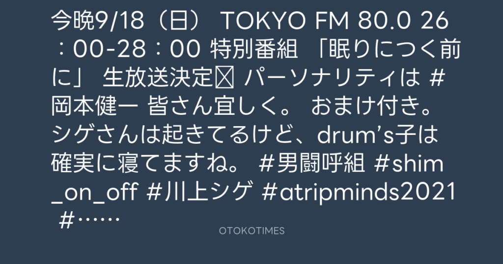 今晩9/18(日) TOKYO FM 80.0 26:00-28:00 特別番組 「眠りにつく前に」 生放送... -