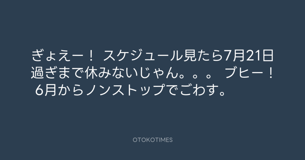 ぎょえー! スケジュール見たら7月21日過ぎまで休みないじゃん。。。 ブヒー! 6月...