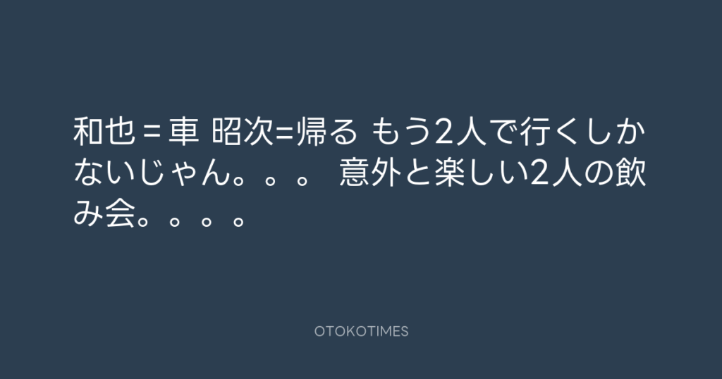 和也=車 昭次=帰る もう2人で行くしかないじゃん。。。 意外と楽しい2人の飲み会... -