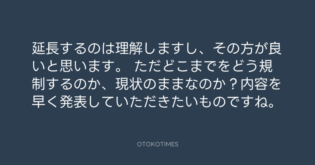 延長するのは理解しますし、その方が良いと思います。 ただどこまでをどう規制する... -