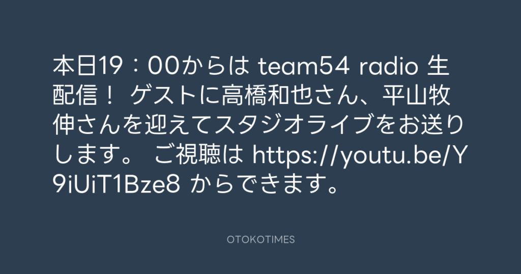 本日19:00からは team54 radio 生配信! ゲストに高橋和也さん、平山牧伸さんを迎... -